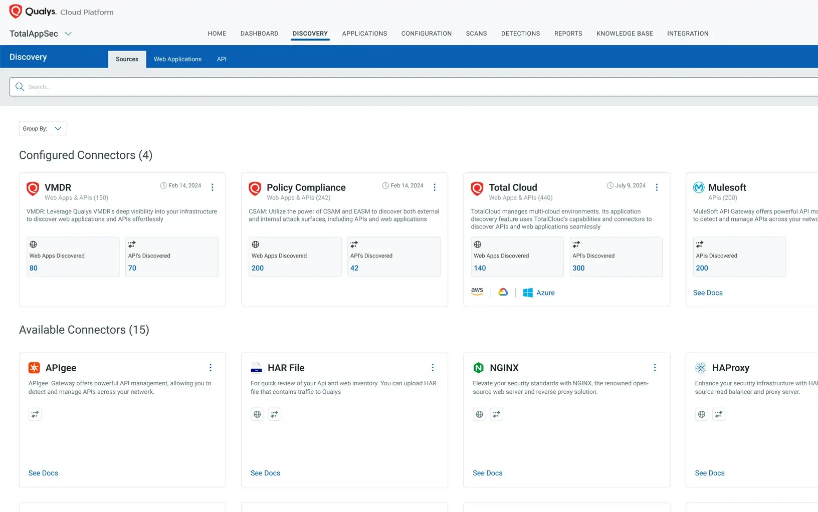 Descubrimiento e inventario completos de aplicaciones web y API internas, externas, conocidas, desconocidas, olvidadas, en la sombra o maliciosas en entornos locales, multicloud, puertas de enlace de API, contenedores, microservicios y más. Gracias a su integración fluida con VMDR, EASM y TotalCloud, ofrece visibilidad unificada para eliminar los puntos ciegos de seguridad.