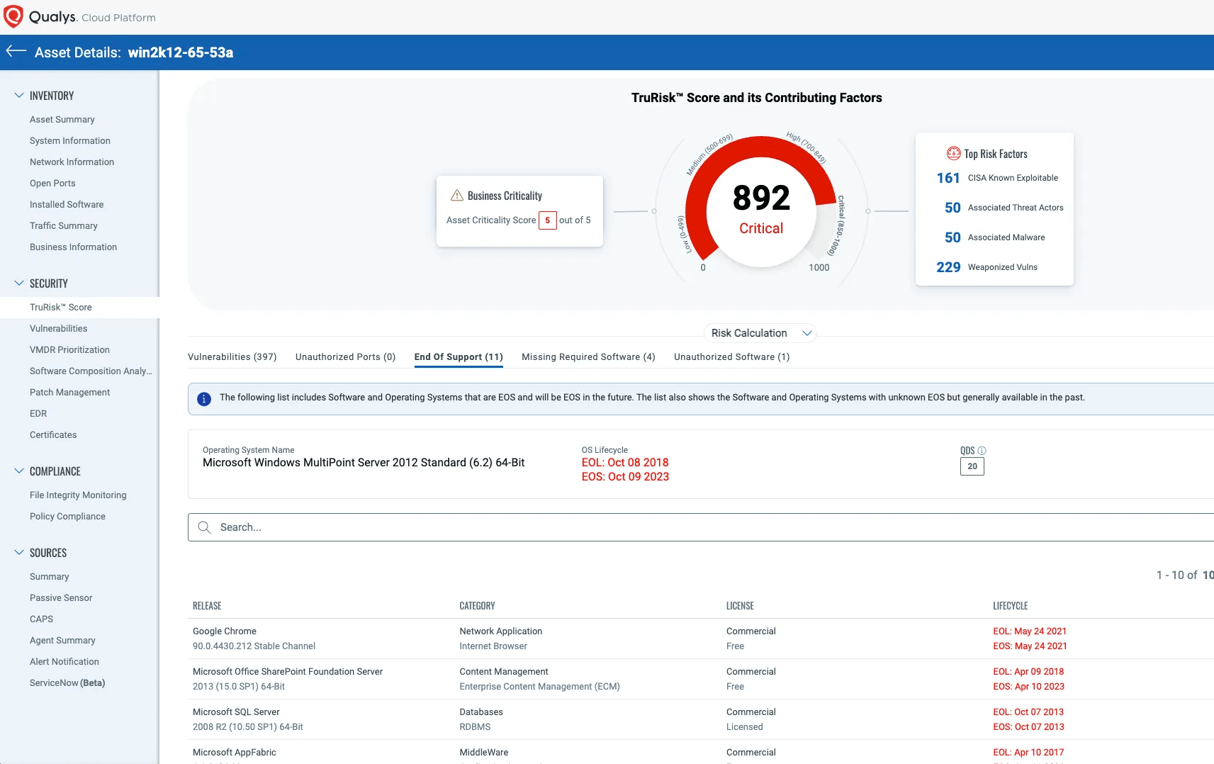 Evalúa de inmediato su riesgo más crítico al descubrir datos clave de activos.Agregue factores de riesgo como software EoL/EoS, agentes y herramientas de seguridad faltantes, puertos no autorizados y certificados SSL vencidos a TruRisk Scoring para priorizar y eliminar el riesgo comercial.
