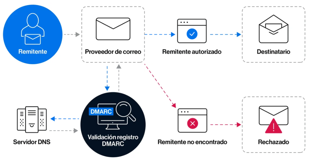 El estándar DMARC corrobora que el remitente del correo electrónico sea legítimo, que el mensaje no haya sido comprometido, y en caso de pasar el proceso de autenticación, procede a entregarlo a la bandeja de entrada, caso contrario lo rechaza.