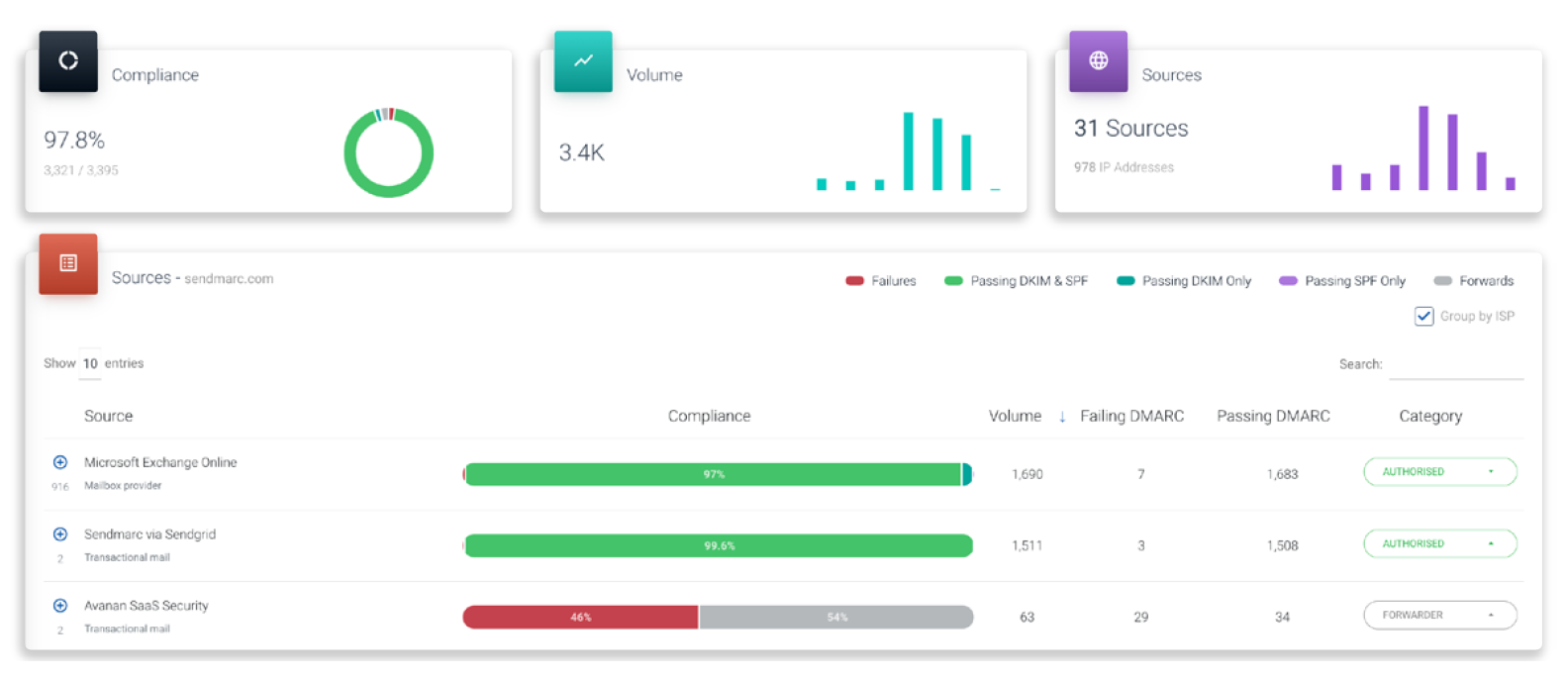 La plataforma DMARC de Sendmarc se encarga del proceso de implementación y gestión de principio a fin. También proporciona una supervisión continua para garantizar el cumplimiento de DMARC más sotisficado para su dominio en todo momento.