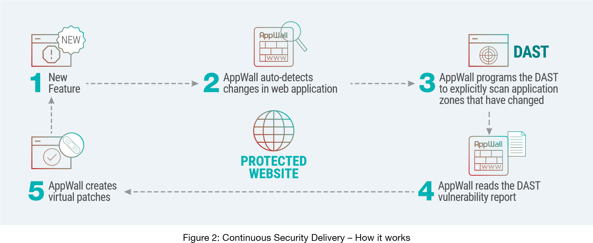 Como las aplicaciones web incorporan continuamente nuevas funciones y recursos, AppWall de Radware detecta automáticamente cualquier cambio en las aplicaciones web (1) en tiempo real e invoca (2) la herramienta DAST para escanear explícitamente (3) las zonas de aplicación específicas que se han modificado. Este escaneo se realiza en minutos, a diferencia de un escaneo completo de la aplicación web que puede llevar horas. A continuación, AppWall lee (4) el informe de vulnerabilidad DAST y lo utiliza para actualizar automáticamente la política de seguridad de la aplicación (5) mediante la creación de los parches virtuales correspondientes. A continuación, se invoca un segundo escaneo de vulnerabilidad para comprobar si la seguridad de la aplicación se ha parcheado correctamente.