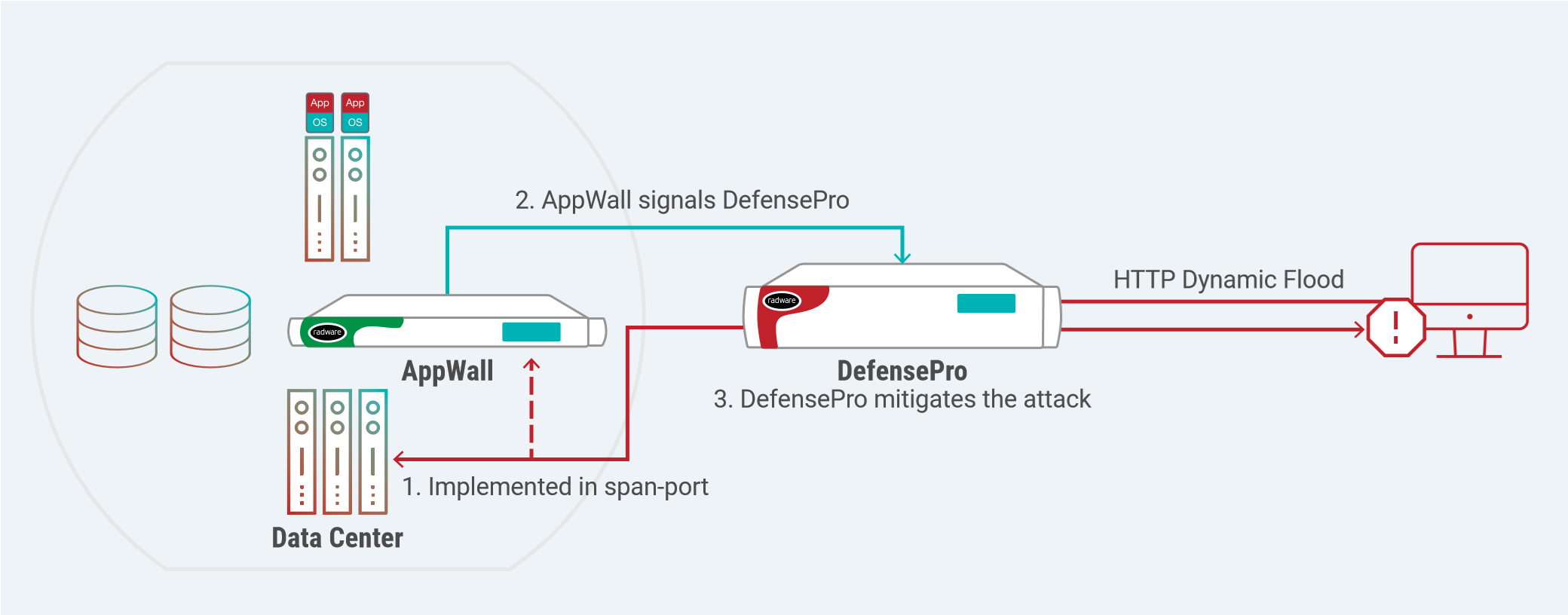 Una vez que AppWall detecta un ataque basado en la web, envía automáticamente un mensaje a DefensePro, que se implementa en el perímetro para mitigar y bloquear los ataques en tiempo real.