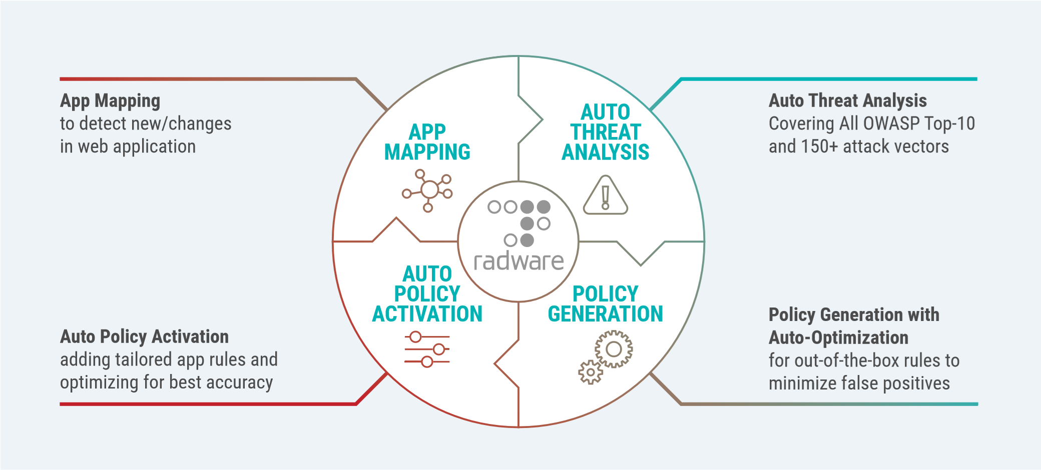 La mejor cobertura de seguridad con un impacto mínimo en el tráfico legítimo es posible gracias a la combinación de modelos de seguridad negativos (que definen lo que está prohibido y aceptan el resto) y positivos (que definen lo que está permitido y rechazan el resto) de Radware. La combinación de los dos modelos permite definiciones de políticas granulares y precisas, lo que evita falsos positivos y falsos negativos. De esa forma, AppWall no solo ofrece la menor cantidad de falsos positivos y un esfuerzo operativo mínimo, sino que también ofrece una protección sólida contra amenazas conocidas y desconocidas (día cero).