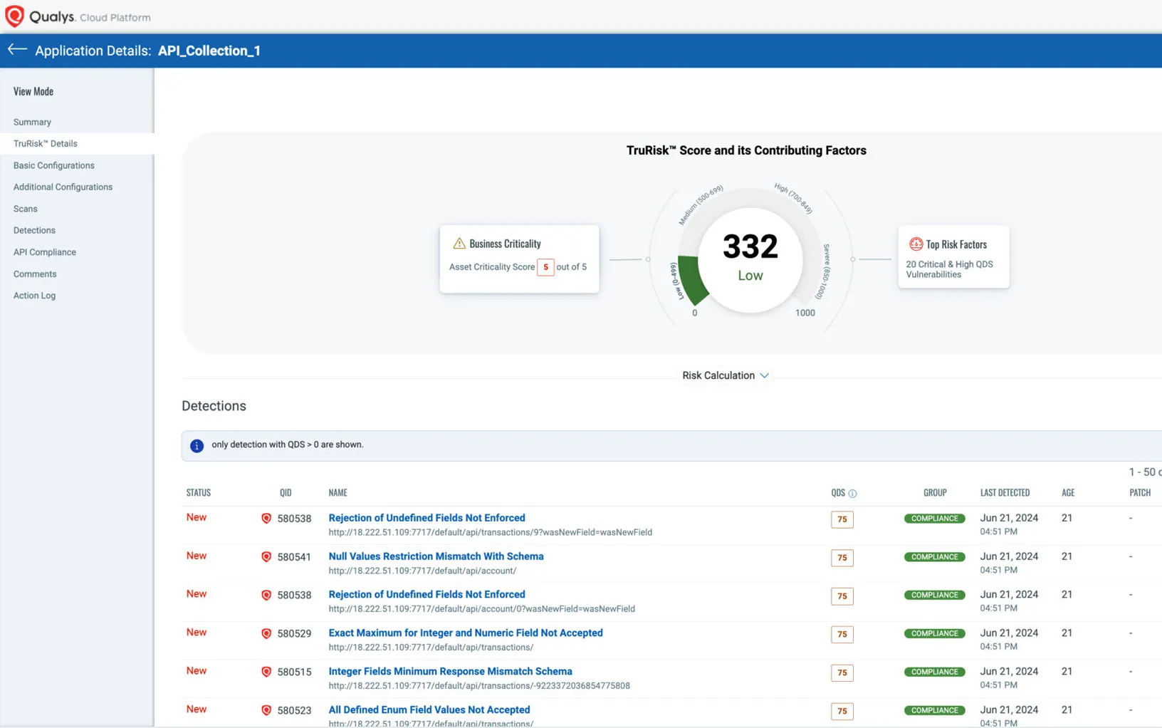 Permite visualizar problemas clave, como el top 10 de vulnerabilidades de OWASP, top 10 de riesgos de API, configuraciones incorrectas, exposición de información personal confidencial y desviaciones de OpenAPI Specification v3 (OAS) y priorizarlos utilizando puntuación TruRisk™ para abordar primero los problemas más críticos.