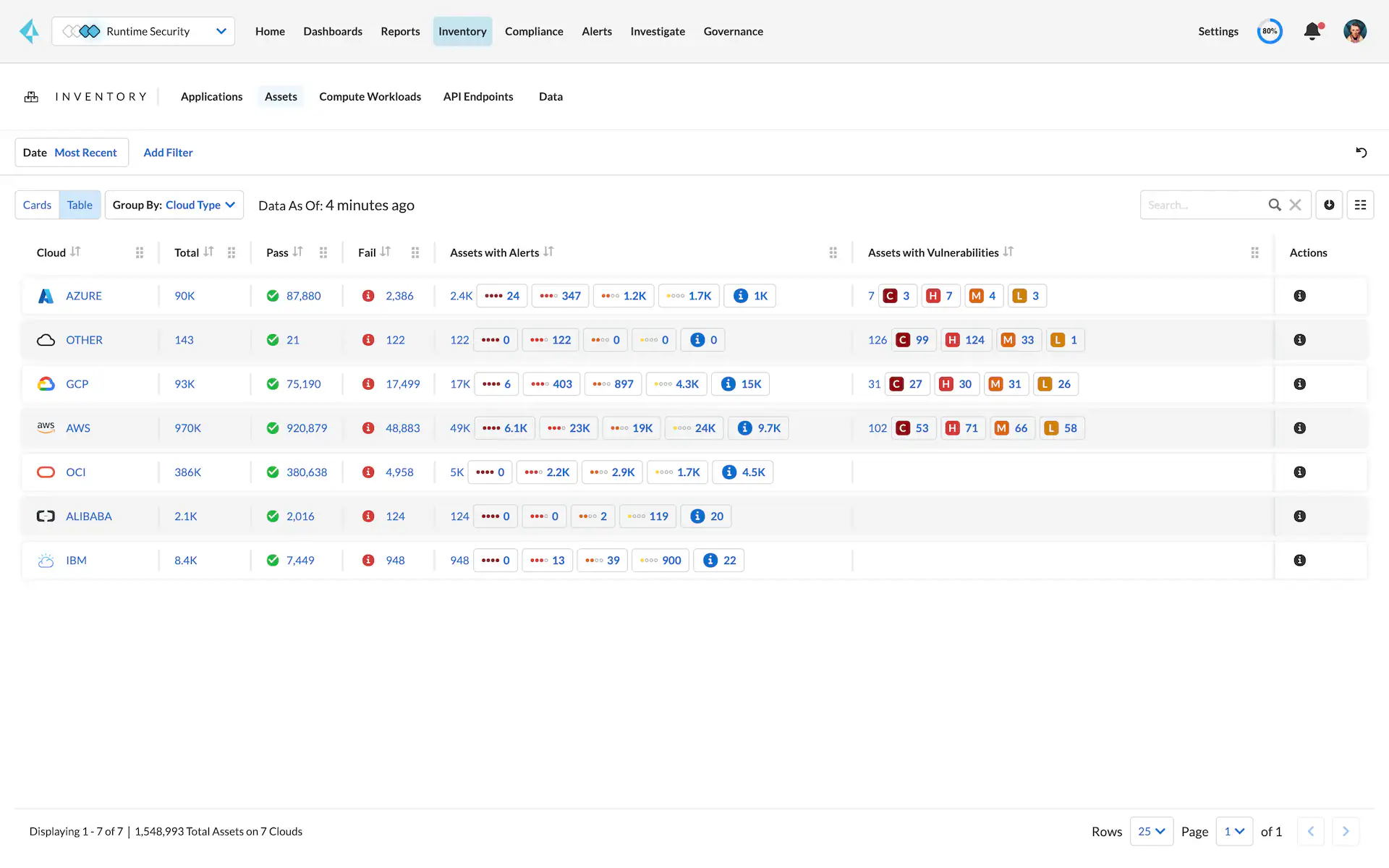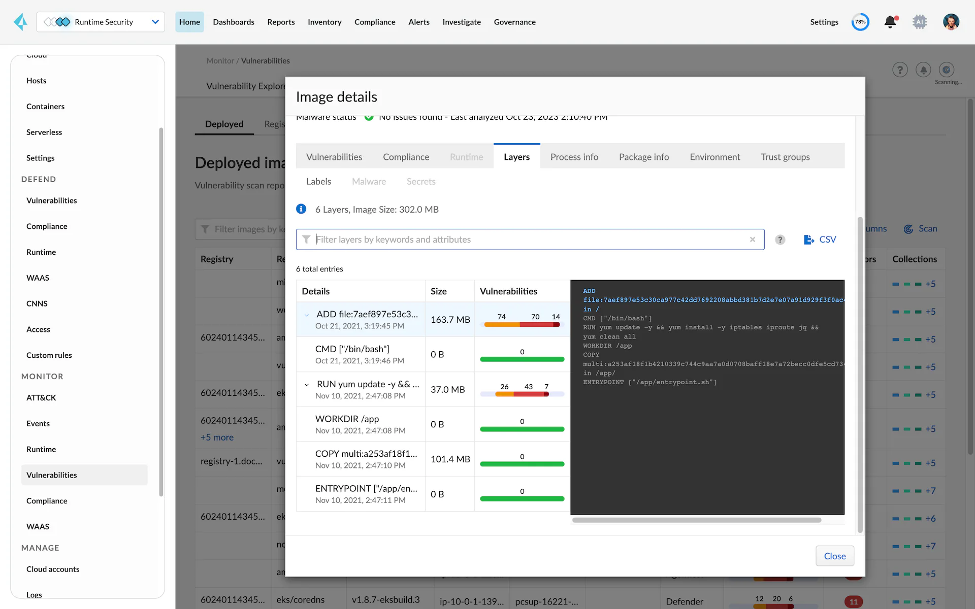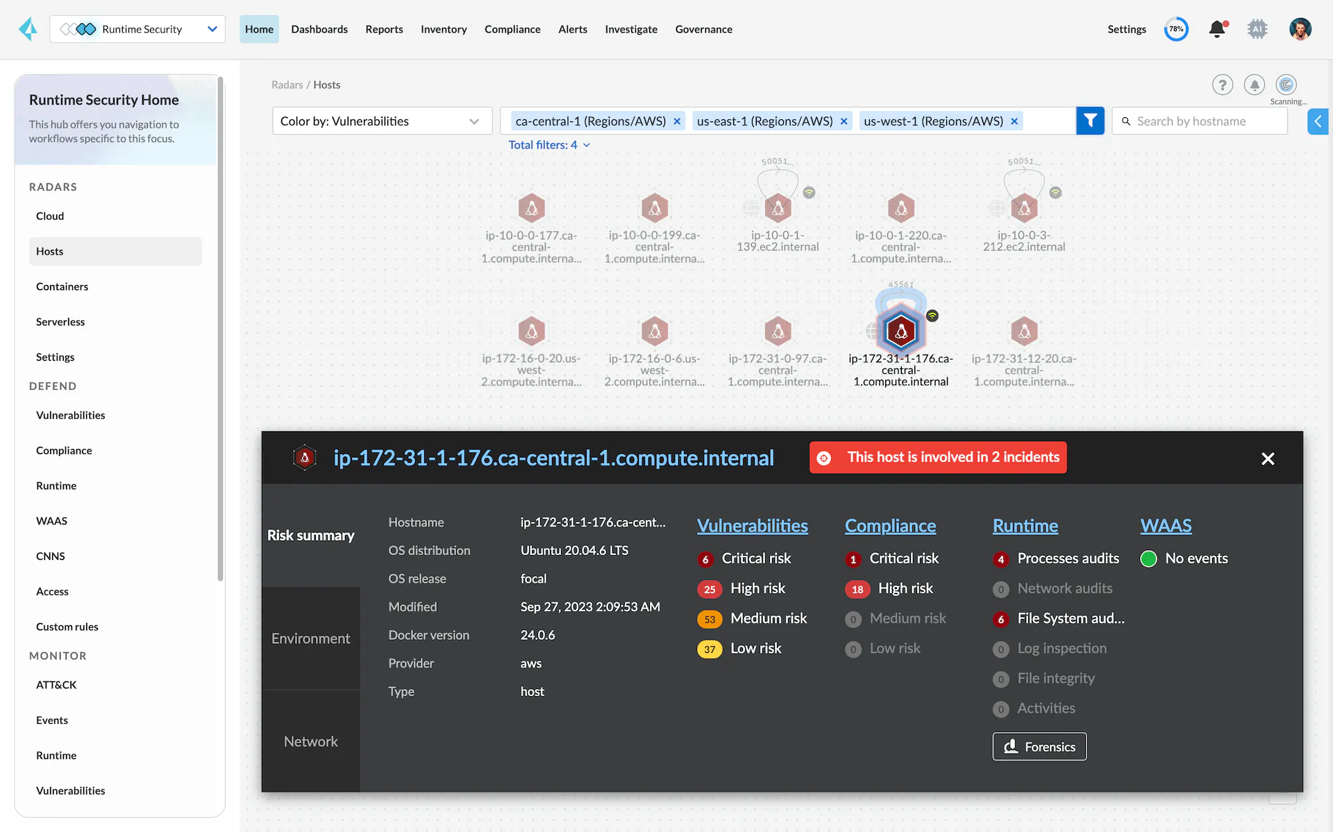 Las aplicaciones nativas de la nube requieren controles diseñados específicamente para obtener visibilidad sobre la postura de cumplimiento y mantener el cumplimiento para infraestructuras dinámicas y efímeras. Prisma Cloud ofrece vistas históricas y en tiempo real sobre el estado de cumplimiento para hosts, contenedores y serverless.