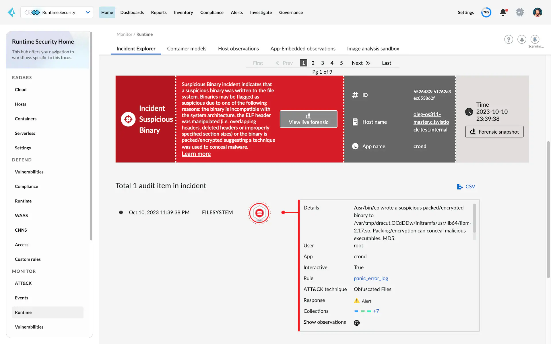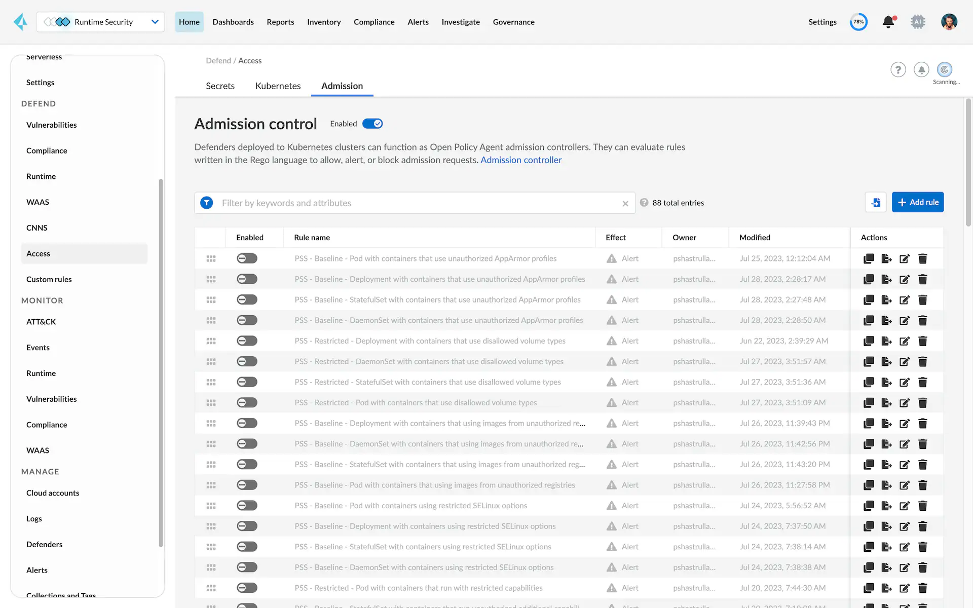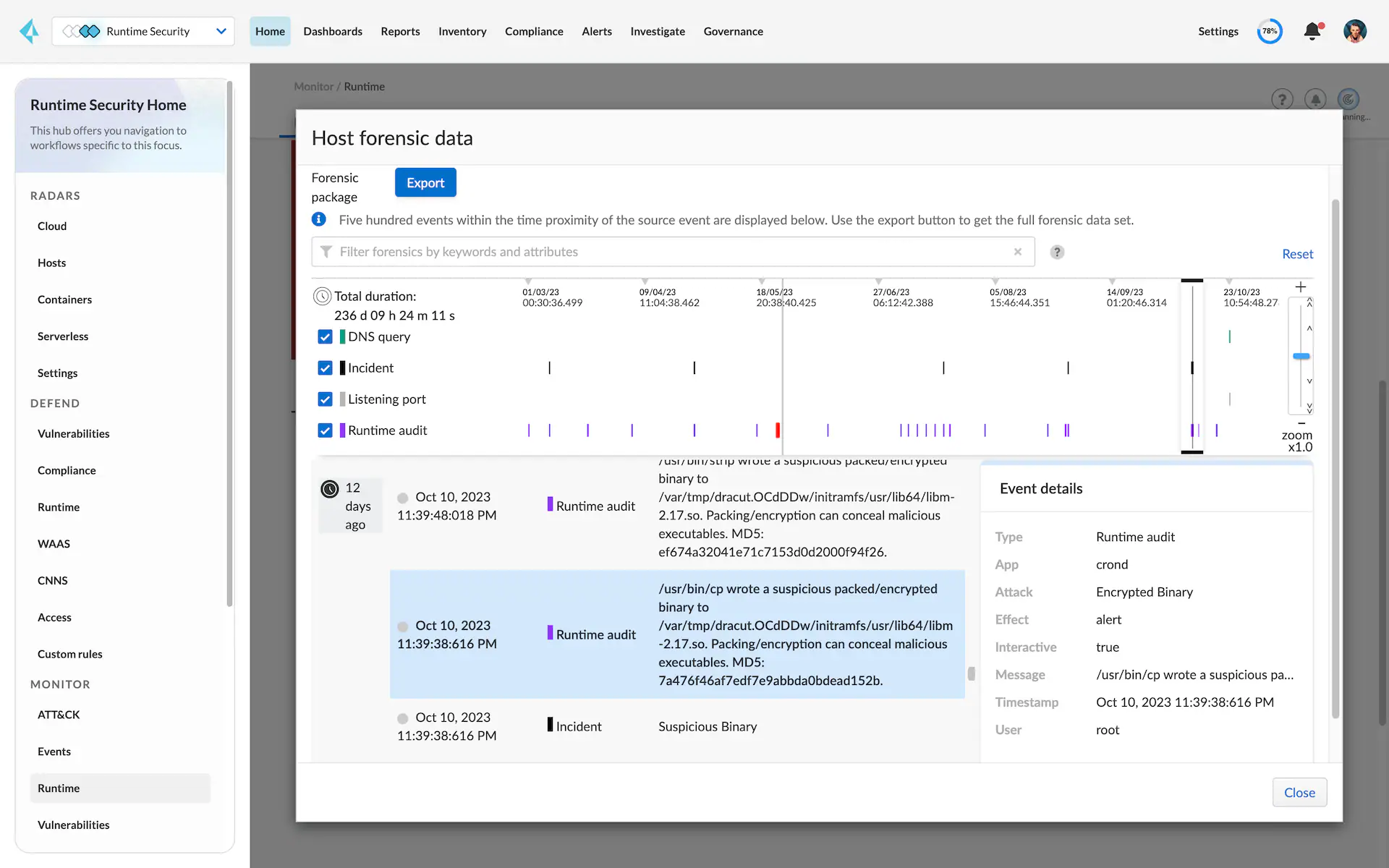 Las aplicaciones nativas de la nube requieren controles diseñados específicamente para obtener visibilidad sobre la postura de cumplimiento y mantener el cumplimiento para infraestructuras dinámicas y efímeras. Prisma Cloud ofrece vistas históricas y en tiempo real sobre el estado de cumplimiento para hosts, contenedores y serverless.
