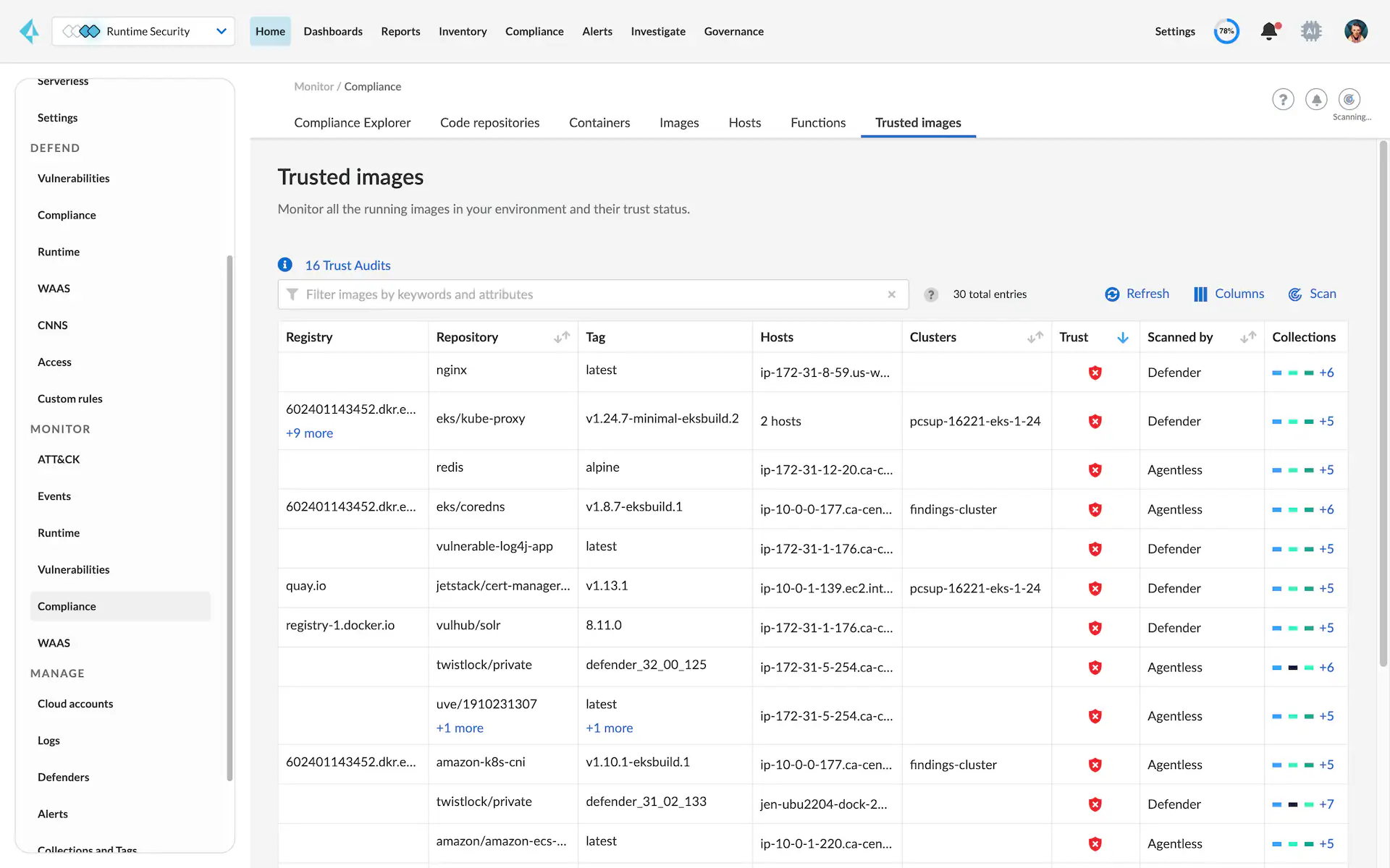 No todas las imágenes de contenedores son iguales. Si bien es práctico extraer imágenes de repositorios externos, lo deja vulnerable a uno de los escenarios de alto riesgo más comunes: estas imágenes pueden contener paquetes obsoletos y vulnerables y pueden contener malware integrado. Trusted Images es un control de seguridad que le permite declarar mediante políticas en qué registros, repositorios e imágenes confía, así como también cómo responder a imágenes no confiables en su entorno.