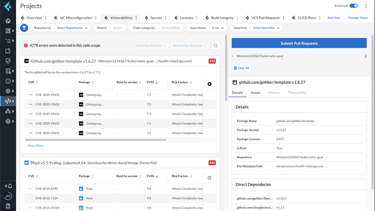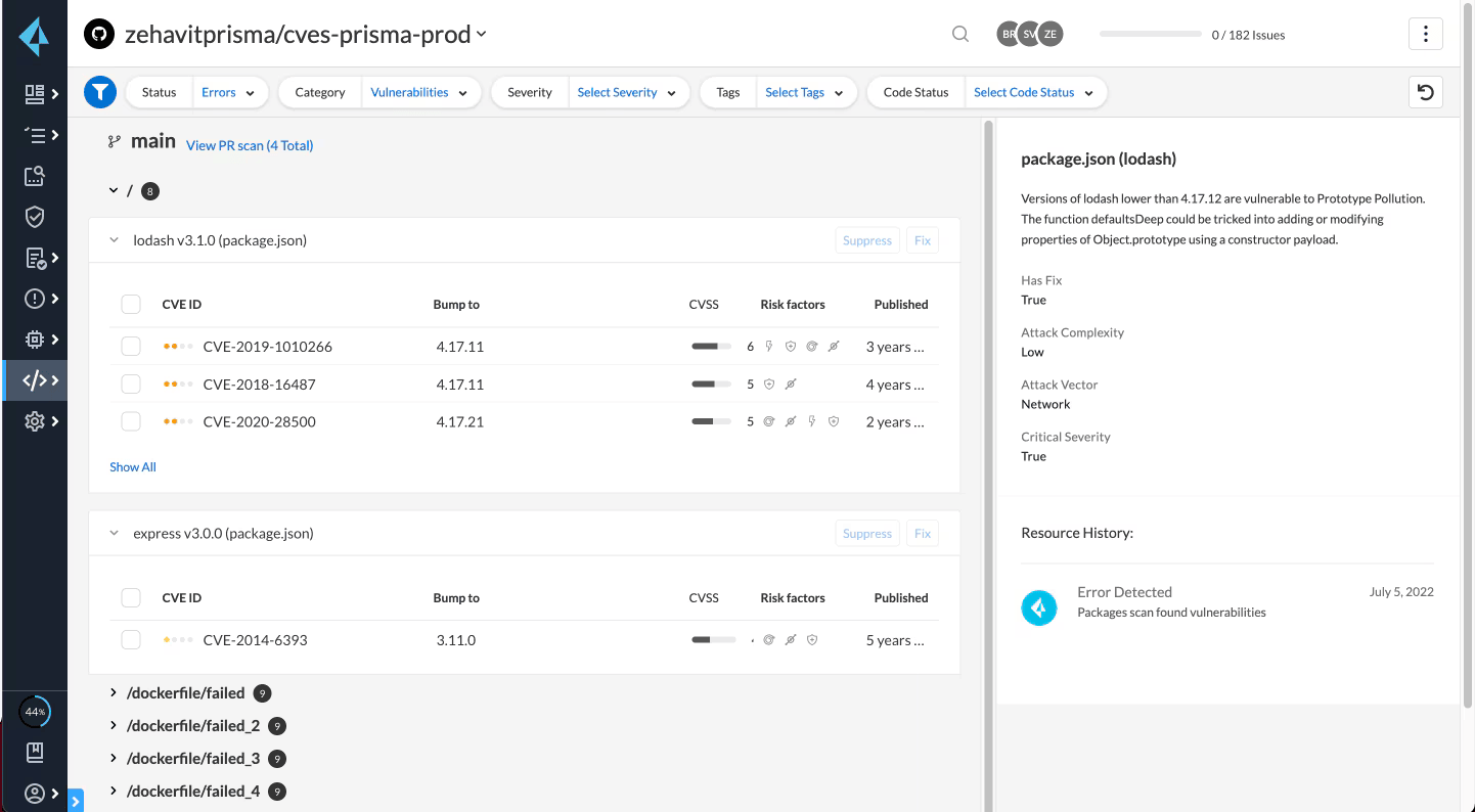 La mayoría del código de las aplicaciones modernas está formada por dependencias de código abierto. La falta de información sobre las dependencias que se están utilizando y el miedo a introducir cambios fatales conducen a que las vulnerabilidades lleguen al código sin corregir. Prisma Cloud se integra con las herramientas de los desarrolladores para identificar vulnerabilidades en paquetes de código abierto y todos sus árboles de dependencia con compatibilidad para correcciones flexibles y controladas con el paso a una nueva versión.