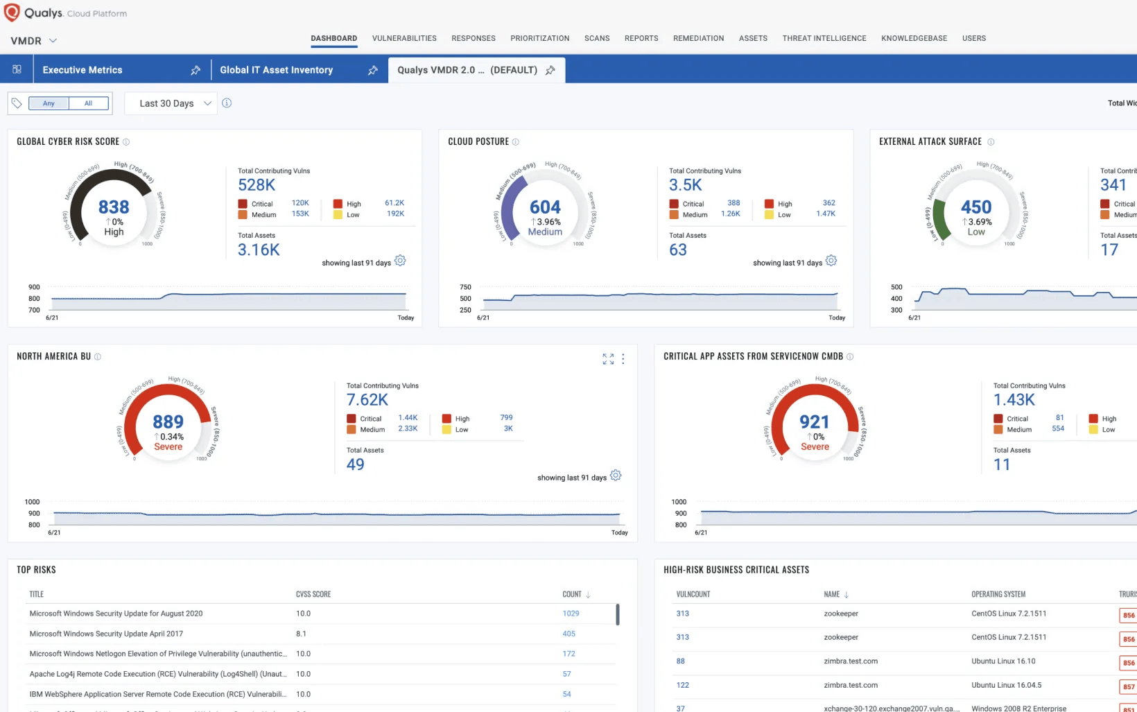 VMDR le permite eliminar el riesgo de su superficie de ataque externa descubriendo un 30% más de activos empresariales procedentes de fusiones, adquisiciones y filiales, mientras detecta automáticamente vulnerabilidades explotables y prioriza el riesgo: