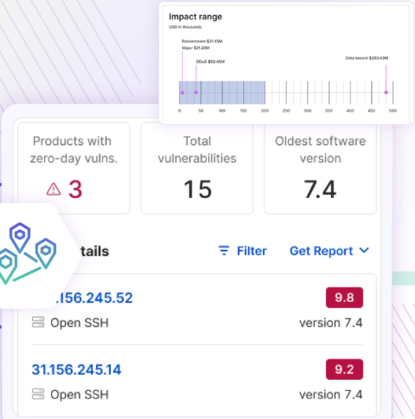 Security Ratings le permite empoderar su equipo de seguridad con análisis potentes impulsados por IA que permiten identificar vulnerabilidades críticas y actuar rápidamente. Obtenga una comprensión completa del impacto financiero potencial de los riesgos cibernéticos para que su equipo de gestión de riesgos cibernéticos pueda tomar decisiones informadas.